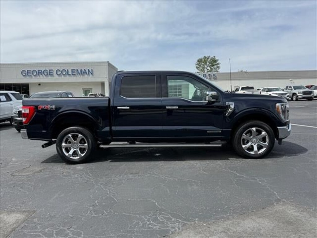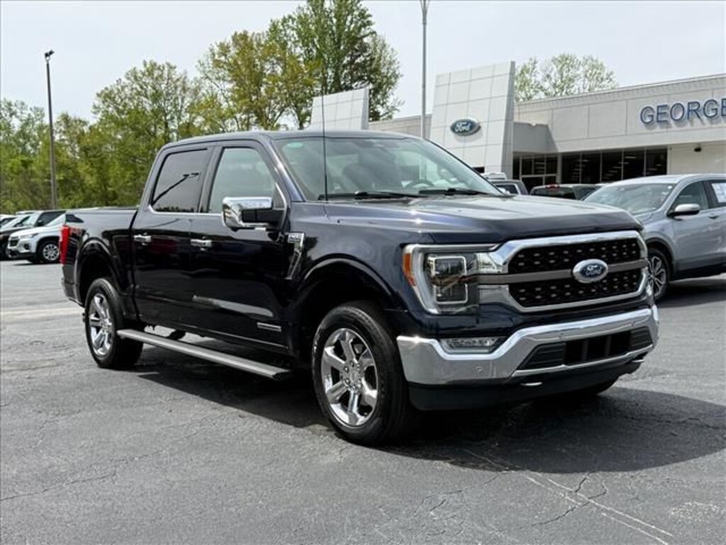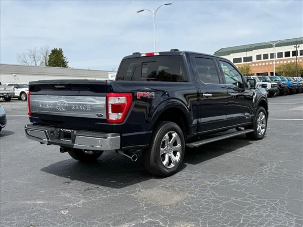 2023 Ford F-150 King Ranch F-150 King Ranch, 4D SuperCrew, 3.5L PowerBoost Full-Hybrid V6, 10-Speed Automatic, 4WD, Antimatter Blue Metallic, Java Leather, 20" Machined-Aluminum Wheels, 360 Degree Camera, 4x4 FX4 Off-Road Bodyside Decal, 8 Speakers, Auto High-beam Headlights, Backup Camera, Bed Utility Package, BoxLink, Bright Belt Moldings, Chrome Door Handles w/Body-Color Strap, Chrome Skull Caps on Exterior Mirrors, Class IV Trailer Hitch Receiver, Delay-off headlights, Electronic Locking w/3.31 Axle Ratio, Equipment Group 601A High, Extended Range 36 Gallon Fuel Tank, Front Bucket Seats, Front fog lights, Fully automatic headlights, FX4 Off-Road Package, Heated front seats, Hill Descent Control, Integrated Trailer Brake Controller, King Ranch Chrome Appearance Package, King Ranch Monochromatic Paint Package, LED Box Lighting, Max Trailer Tow Package, Memory seat, Monotube Rear Shocks, Multi-Contour Driver & Passenger Seats, Off-Road Tuned Front Shock Absorbers, Painted Body-Color Wheellip Molding, Pedal memory, Power driver seat, Power Tailgate, Power windows, Power-Deployable Running Boards, Pro Trailer Backup Assist & Pro Trailer Hitch Assist, Radio: B&O Unleashed Sound System by Bang & Olufsen, Remote keyless entry, Rock Crawl Mode, Steering wheel memory, Steering wheel mounted audio controls, Tailgate Step w/Tailgate Work Surface, Tray Style Floor Liner, Twin Panel Moonroof, Wheels: 20" Chrome-Like PVD. CARFAX One-Owner. Odometer is 5333 miles below market average! King Ranch